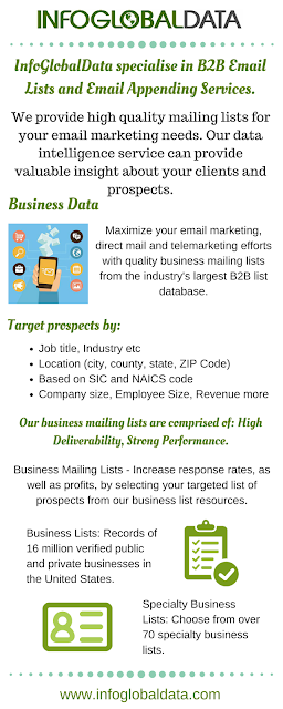 InfoGlobalData specialise in B2B Email Lists and Email Appending Services. We provide high quality mailing lists for your email marketing needs. Our data intelligence service can provide valuable insight about your clients and prospects.